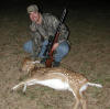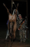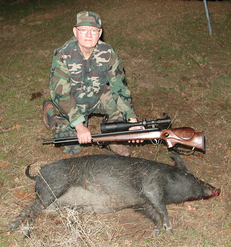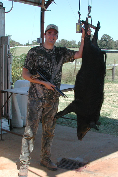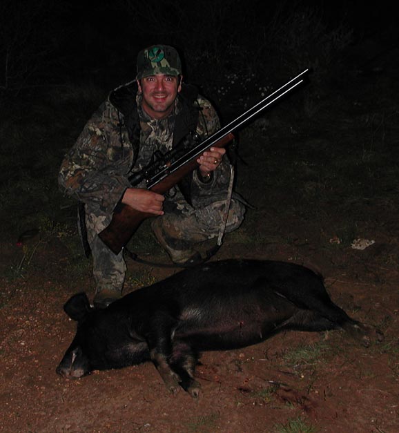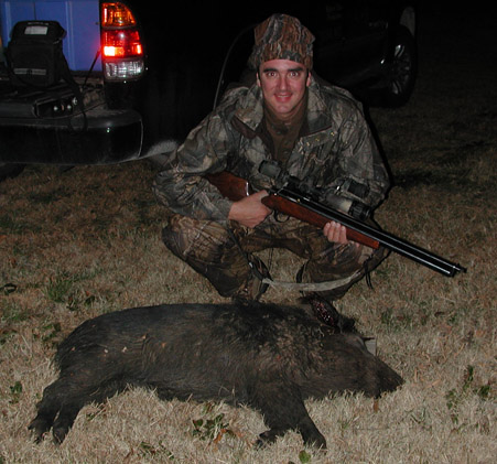 John Bennett shot this 200lb sow from 45 yards with my .308 using the 119 grn pellets. It was hit in the spine and was finished off with a shot to the head. Mighty fine shooting even though it was so dark.