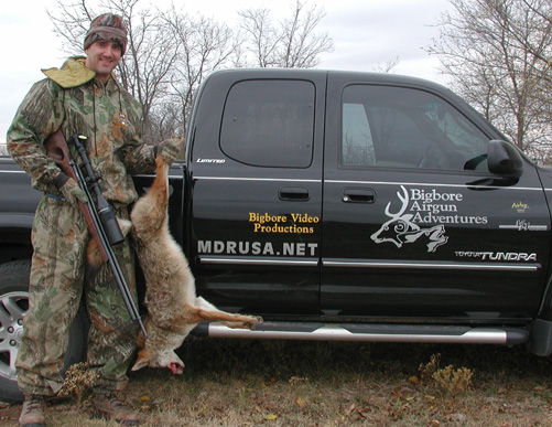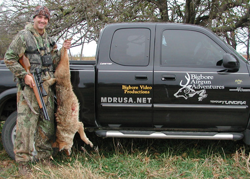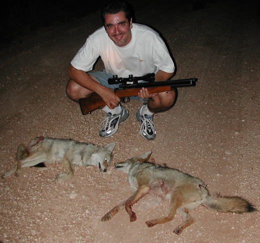 This is Terry Tate with a couple yotes he shot near his home with his Quackenbush .308 using 130 grn rn pellets. One yote was shot at a distance of 130 yds passing clean thru him behind the shoulder at went only 20 yds before he fell. The second was taken at 60 yards and was shot thru both shoulders which dropped him instantly.