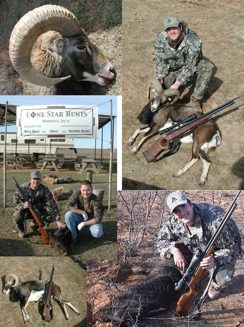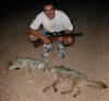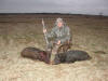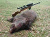 This hunt was awesome! We (Mark Bolson and I) stalked the ram from 200 yards to 32 yards. It dropped instantly with a shot behind the shoulder using a 140 grain spitzer out of my .308 . The hog took a shot to the head from 40 yards with a 412 grain hp shot from the .458 mag. He weighed in at 100lbs.