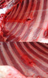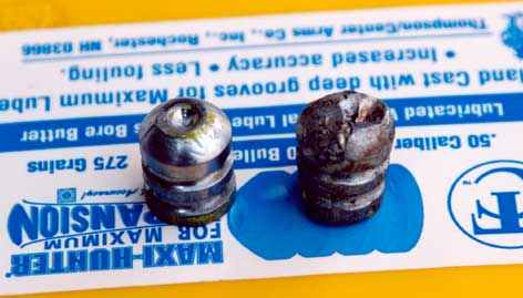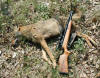 I took my first axis deer with my .50 cal Quackenbush on Dec. 30, 2002. In the second picture you can see the entrance hole the 277 grain "pellet" made at 50 yards. In the third picture you can see the bulge of the "pellet" just under the skin in the center of the image. The "pellet" broke a rib on entrance almost came out the other side. The fourth pic compares the retrieved "pellet" to a new one. The final pic is for your enjoyment. The close feeder is at 97 yards.