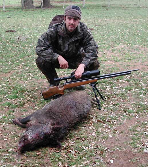 I was in central Texas on a varmint hunt when this 160 lb pig came out of the bushes at 25 yds. It took a 130 grain pellet between the eyes before it dropped. Man these critters are good eaten!