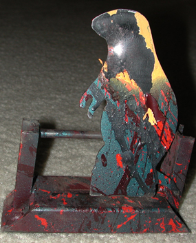 This metal target from Johnston Target Works was shot at 130 yards with a 95 grn pellet at 895 fps= 169 ftlbs. The 115 grn travels at 865 fps= 191 ftlbs.